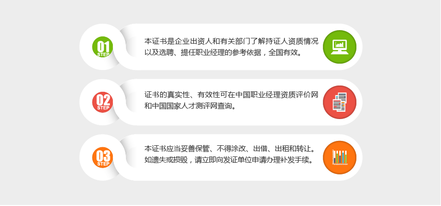 通过考试和评价的学员,由职业经理研究中心颁发高级职业经理资质证书,人力资源和社会保障部全国人才流动中心为参加高级职业经理资质评价并合格的学员出具反映素质能力的人才素质测评证书。高级职业经理资质证书和人才素质测评证书基本反映了持证人的素质和能力状况,为持证人流动和升职提供了素质与能力的证明,为企业聘任经营管理人才提供了资质证明。